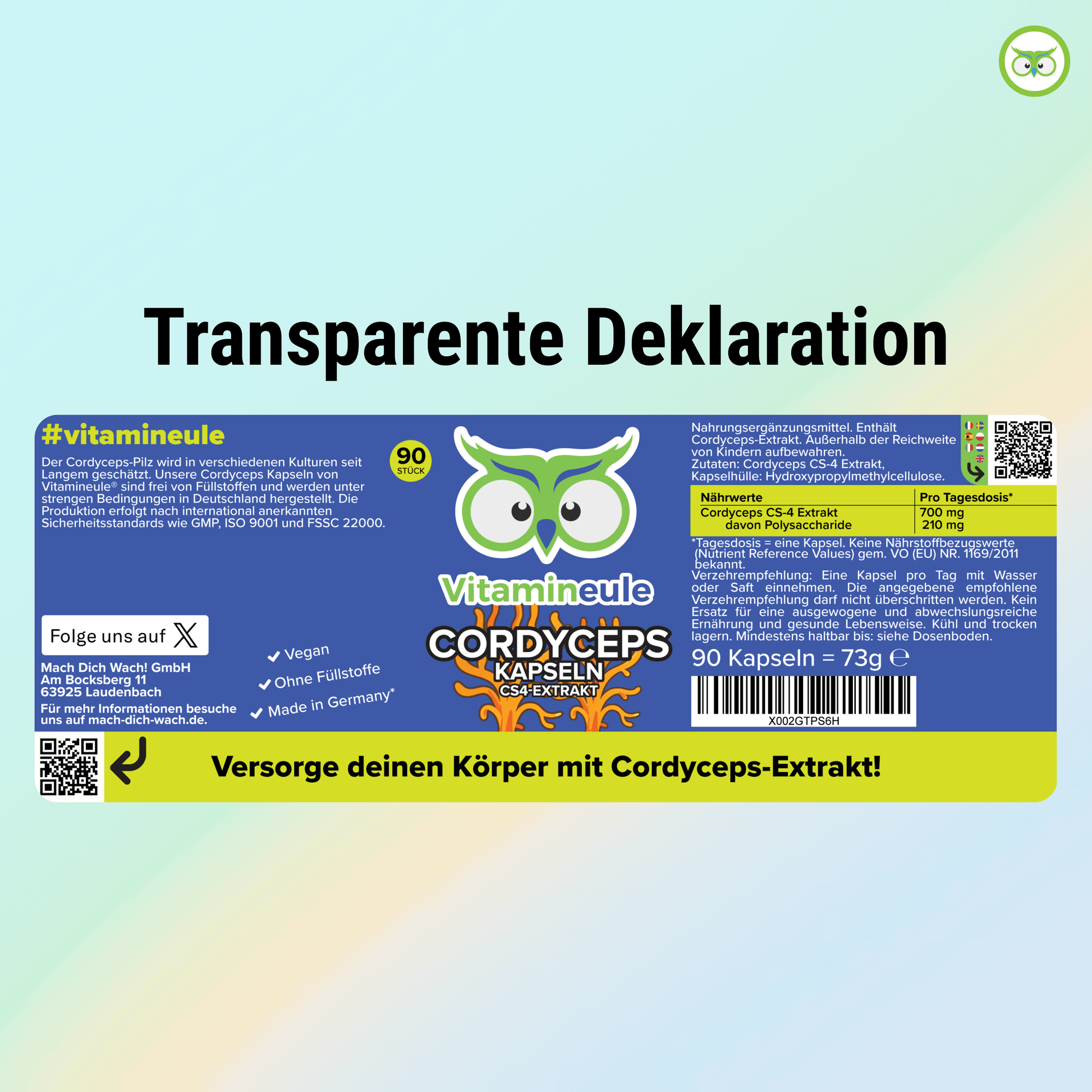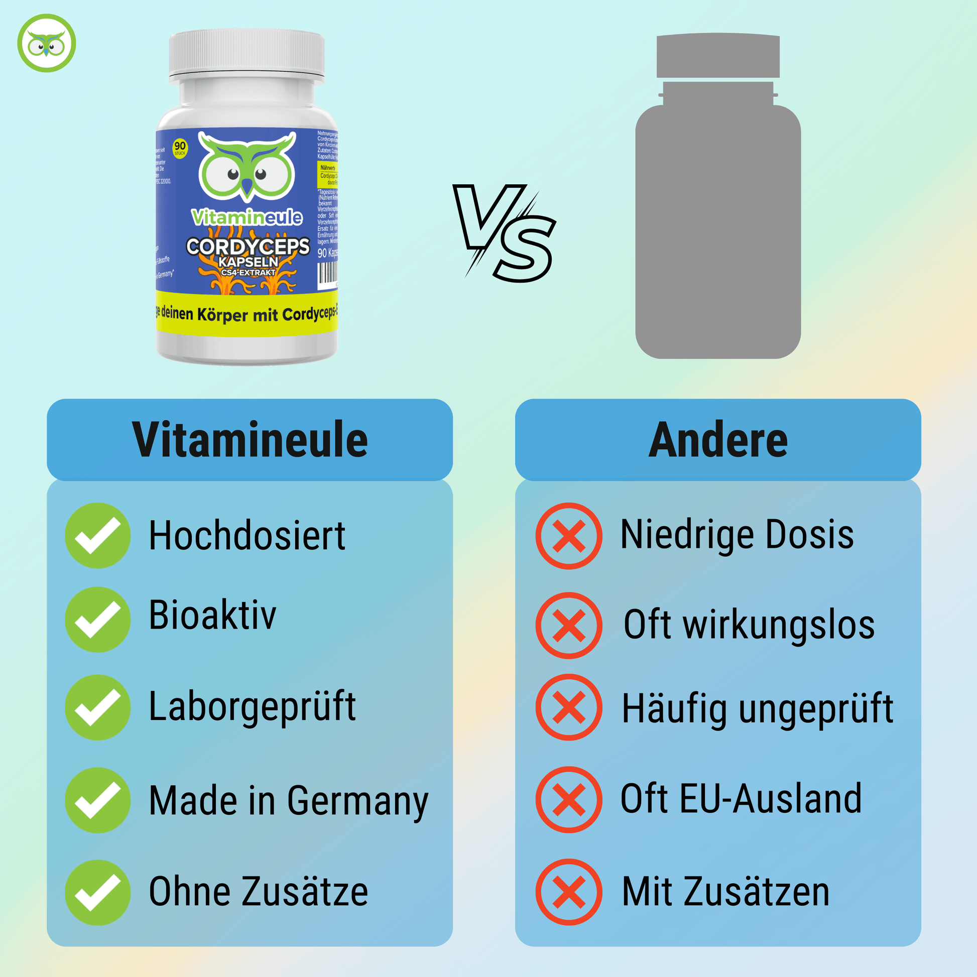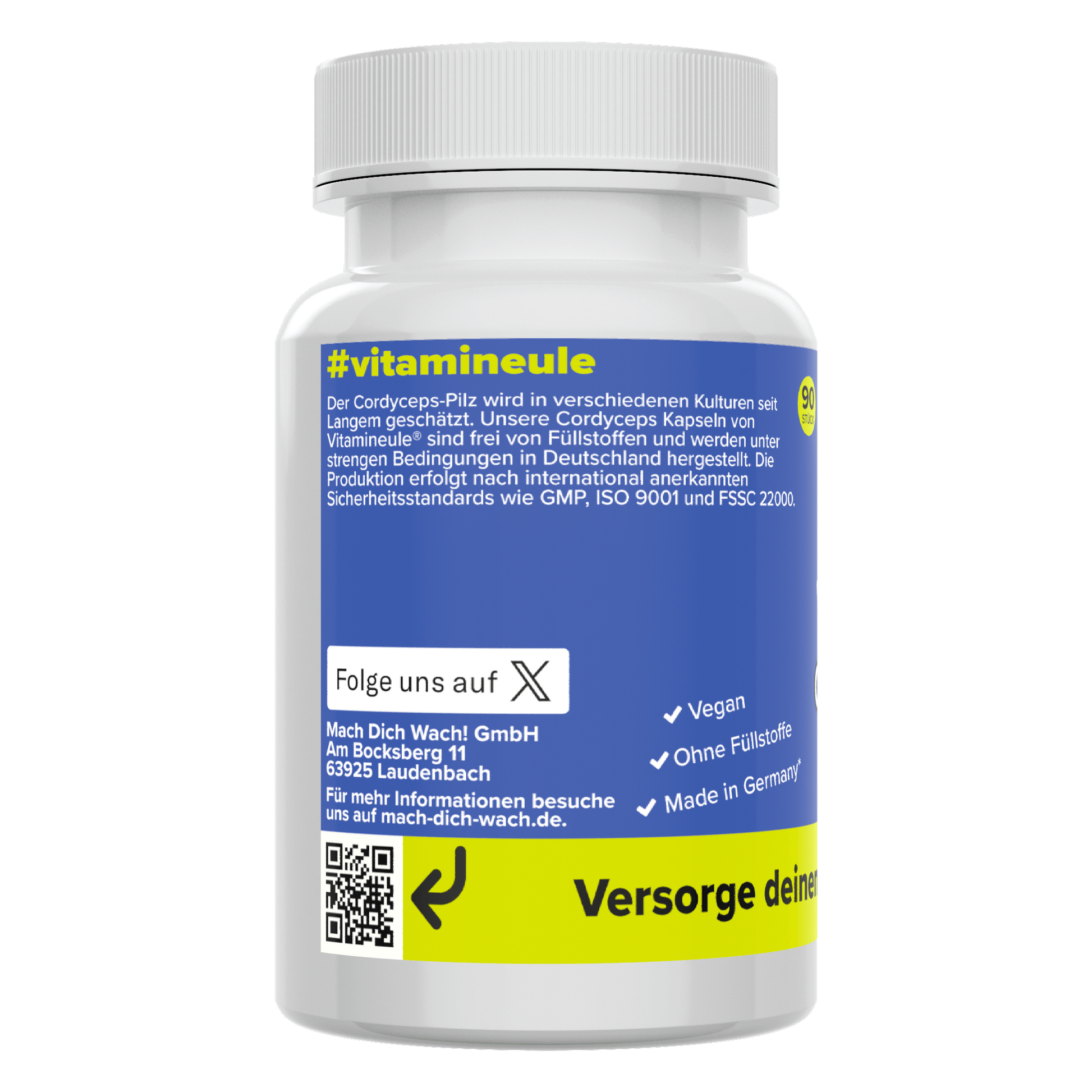 Unsere Vitamineule® Cordyceps Kapseln enthalten hochwertigen CS-4 Extrakt mit definiertem Polysaccharidgehalt. Die Herstellung erfolgt in Deutschland unter strengen Qualitätskontrollen und ohne den Einsatz künstlicher Zusatzstoffe.