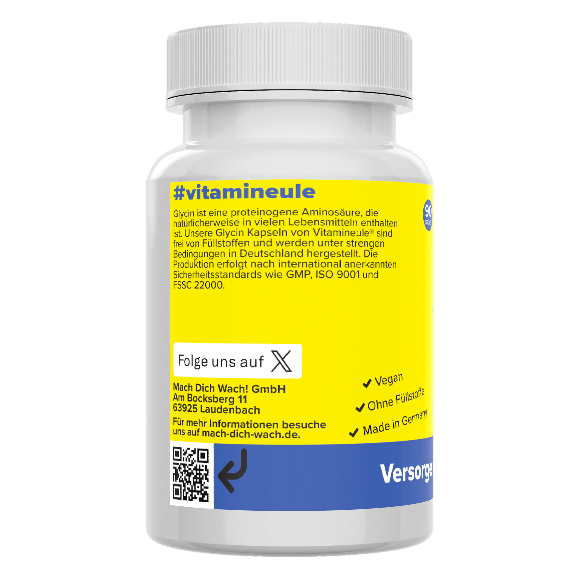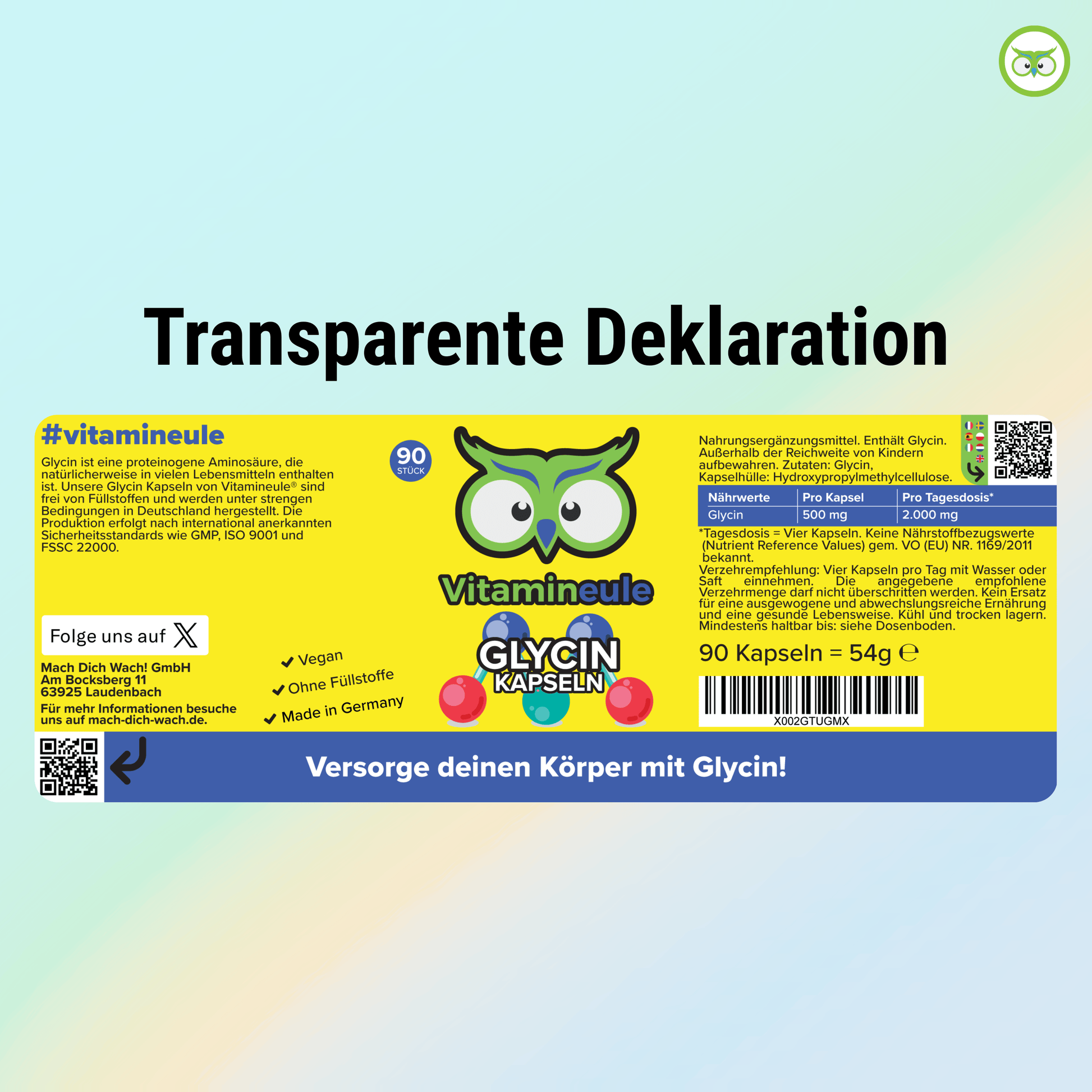 Unsere Vitamineule® Glycin Kapseln enthalten Glycin in reiner Form und definierter Dosierung. Die Herstellung erfolgt in Deutschland unter strengen Qualitätsvorgaben. Das Produkt ist frei von künstlichen Zusatzstoffen und vollständig vegan.