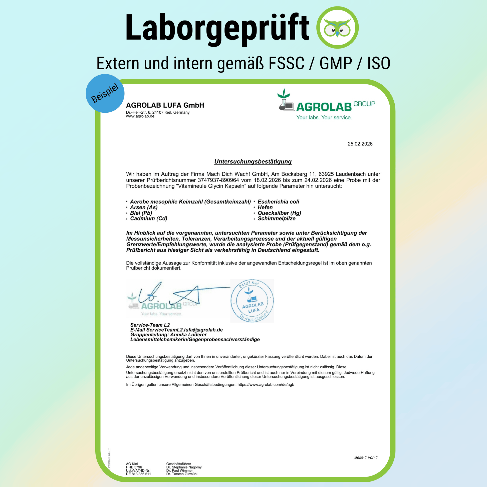 In contrast to other manufacturers, each of our batches is tested individually in the laboratory in several steps. The check is carried out both internally and externally. Production, assembly and packaging are carried out exclusively in Germany in accordance with the FSSC 22000 certification, Germany's strictest quality standard for the production of food and nutritional supplements. The marketability certificate can be viewed under the product images.