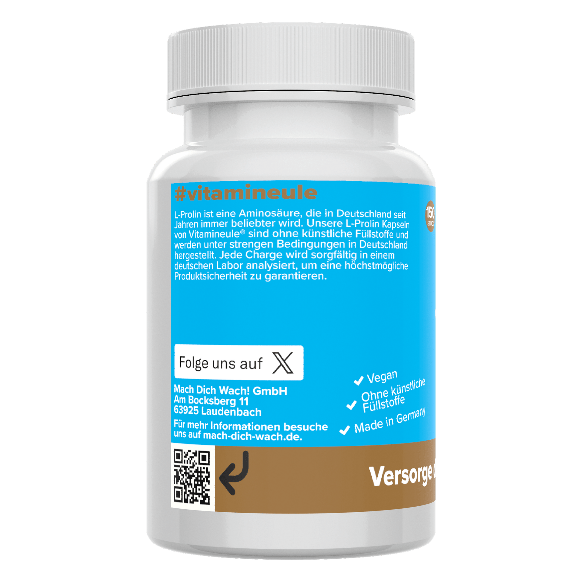 Our Vitamineule® L-Proline capsules are made in Germany and are free of artificial additives. Each capsule contains 500 mg of pure L-Proline and is 100% vegan. Thanks to the natural ingredients, the capsules are also suitable for allergy sufferers. Each batch is individually tested by an independent laboratory to ensure the highest product quality.
