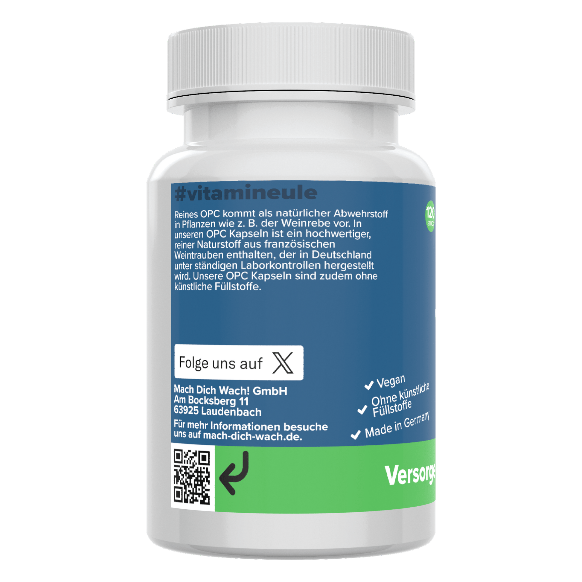 OPC (oligomeric proanthocyanidins) are natural compounds that occur in high concentrations in grape seeds. Our OPC capsules contain a high-quality, pure natural substance that is extracted from 100% French grapes and is manufactured in Germany under constant laboratory controls. Our OPC capsules are free of artificial additives and contain only natural ingredients.