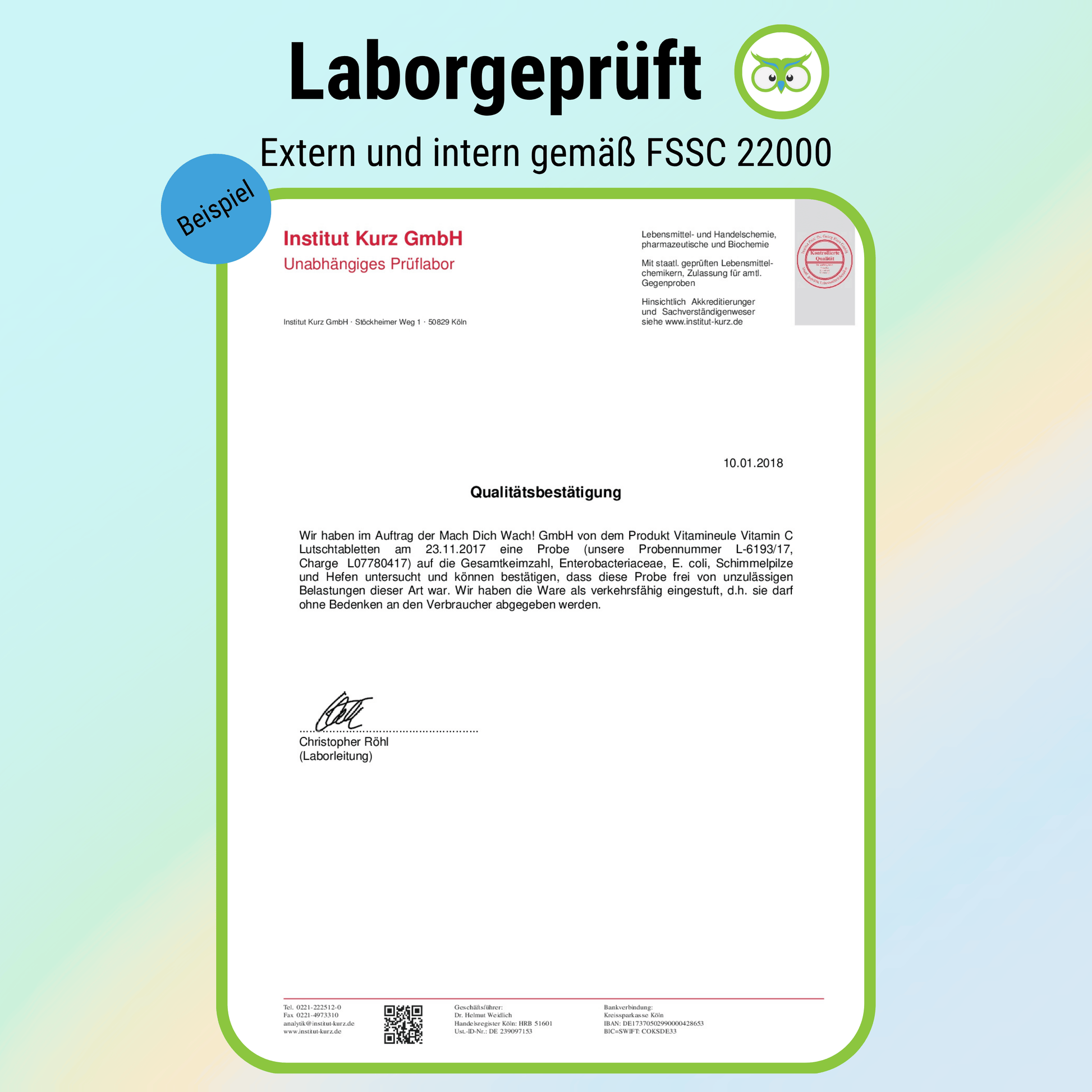 In contrast to other manufacturers, each of our batches is tested individually in the laboratory in several steps. The check is carried out both internally and externally. Production, assembly and packaging are carried out exclusively in Germany in accordance with the FSSC 22000 certification, Germany's strictest quality standard for the production of food and nutritional supplements. The marketability certificate can be viewed under the product images.
